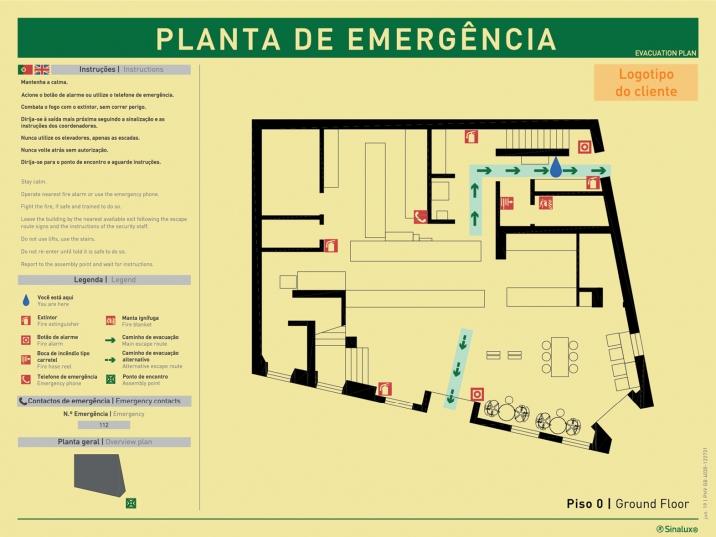 • Planta de emergência horizontal de piso, com legendas e instruções gerais de segurança (horizontais) em português e inglês Ref. APHHGB